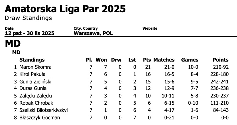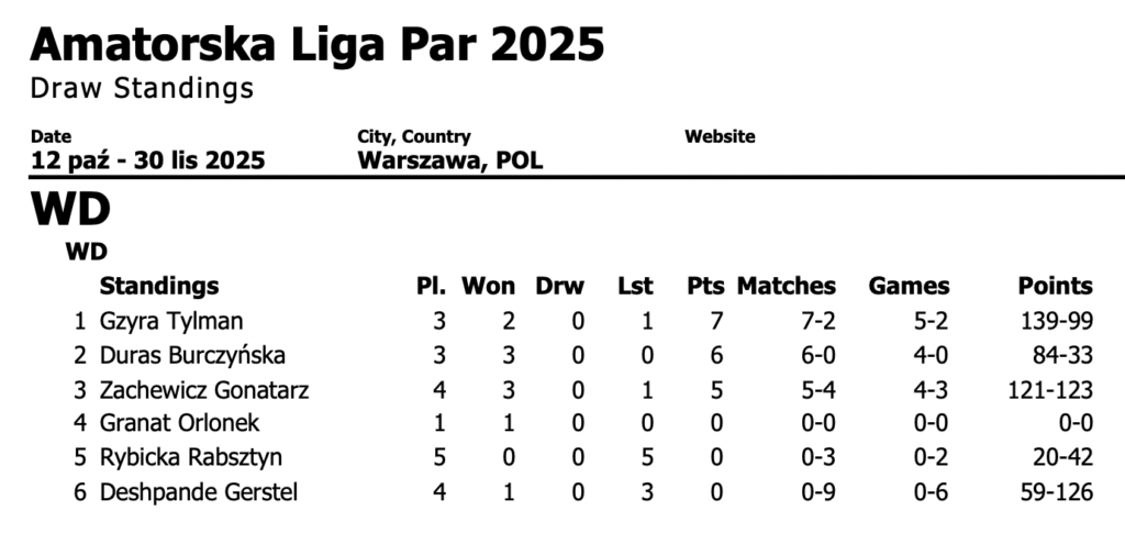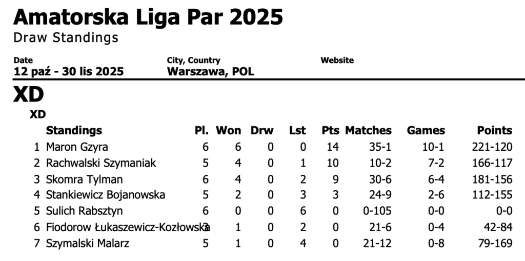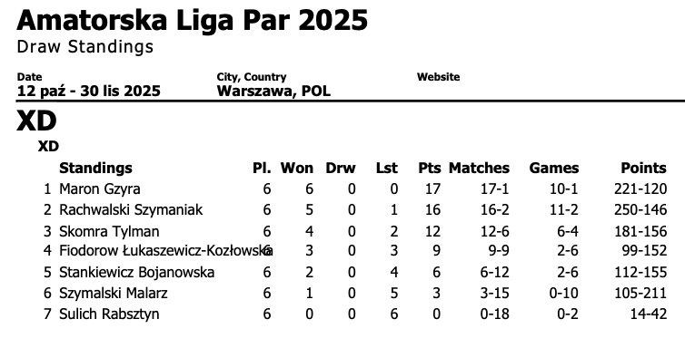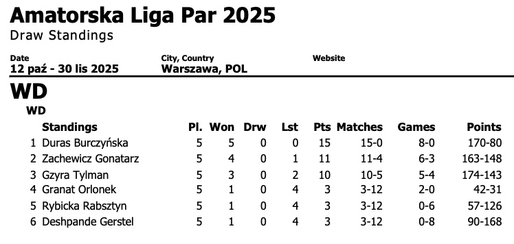– pary, które zajmą miejsca 1-3 w każdej lidze otrzymują puchary.